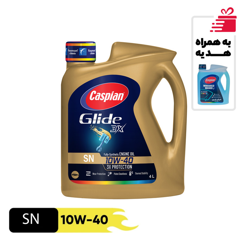 روغن موتور خودرو بنزینی کاسپین مدل 10W-40 SN حجم 4 لیتر به همراه محلول شیشهشوی خودرو کاسپین مدل Non-Smearing حجم 4 لیتر