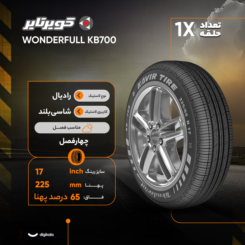 این محصول به عنوان یک تایر رادیال چهارفصل، عملکردی قابل اعتماد را در تمام طول سال برای کاربری شاسیبلند فراهم میکند. این لاستیک تولید سال ۲۰۲۵، با پهنای ۲۲۵ میلیمتر، فاق ۶۵ درصد پهنا و برای رینگهای ۱۷ اینچی طراحی شده است. طرح آج WONDERFULL KB700 به گونهای مهندسی شده که علاوه بر فرمانپذیری عالی، سواری نرم و بسیار کمصدایی را برای سرنشینان به ارمغان میآورد. در نهایت، لاستیک کویر تایر WONDERFULL KB700 برای رانندگان خودروهای شاسی بلندی که به دنبال بهترین عملکرد ممکن بر اساس استانداردهای جهانی هستند، یک انتخاب هوشمندانه و برتر است.